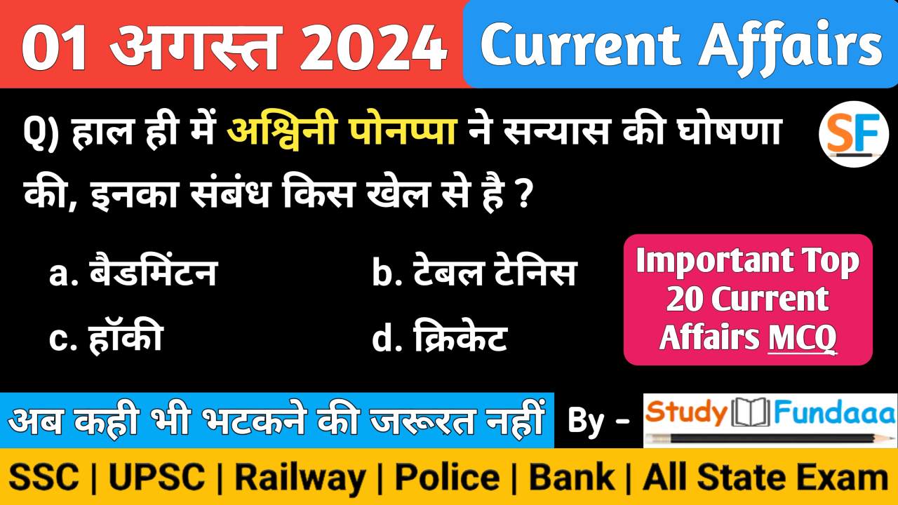 1 August 2024 Current Affairs Mcq | 1 अगस्त 2024 करंट अफेयर्स